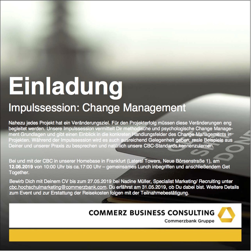 Einladung Impulssession: Change Management Nahezu jedes Projekt hat ein Veränderungsziel. Für den Projekterfolg müssen diese Veränderungen eng begleitet werden. Unsere Impulssession vermittelt Dir methodisch und psychologische Change Management Grundlagen und gibt einen Einblick in die konkreten Handlungsfelder des Change Management in Projekten. Während der Impulssession wird es euch ausreichend Gelegenheit geben, reale Beispiele aus Deiner und unserer Praxis zu besprechen und natürlich unsere CBC-Standards kennenzulernen. Bei und mit der CBC in unserer Homebase in Frankfurt (Lateral Towers, Neue Börsenstraße 1), am 12.06.2019 von 10:00 Uhr bis ca 17:00 Uhr - gemeinsames Lunch inbegriffen und anschließendem Get Together. Bewirb dich mit deinem CV bis zum 27.05.2019 bei Nadine Müller, Specialist Marketing/ Recruiting unter cbc.hochschulmarketing@commerzbank.com. Du erfährst am 31.05.2019, ob Du dabei bist. Weitere Details zum Event und zur Erstattung der Reisekosten folgen mit der Teilnahmebestätigung. Flyer